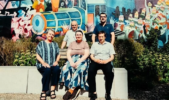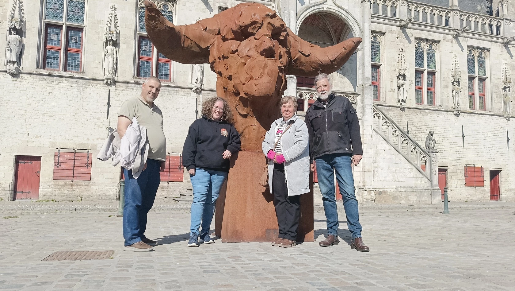 Gastheren Olivier Bodyn (Wijnen Bodyn), Peter Monbaliu (gids), Harry Luypaert (Tearoom De Zeebries) en...